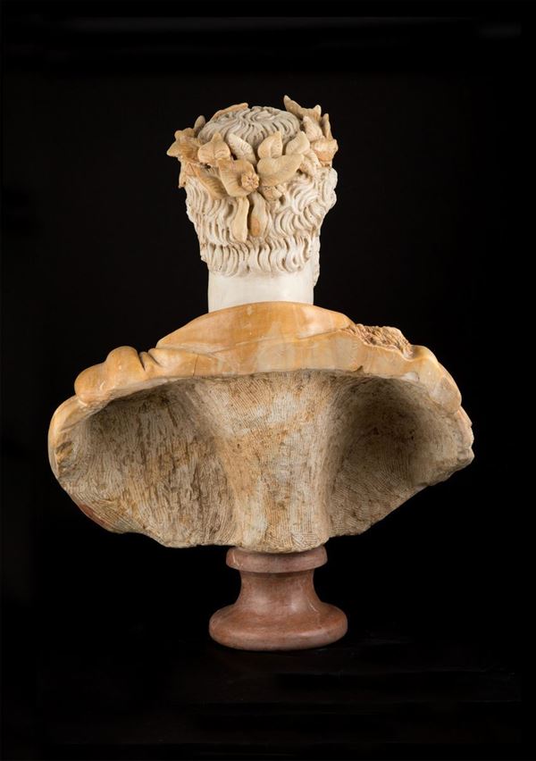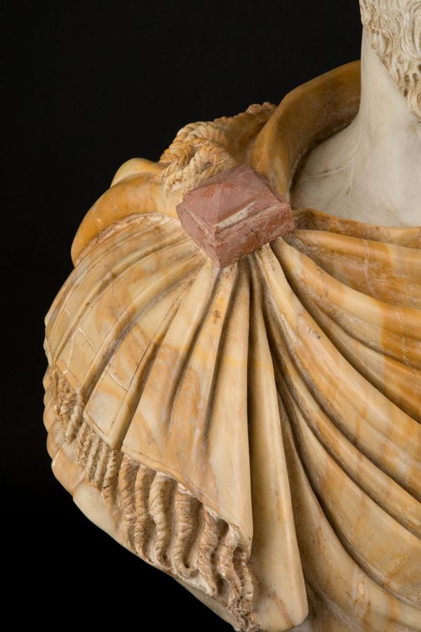 Scultura in marmo giallo e bianco statuario raffigurante "IMPERATORE ROMANO". XX secolo.