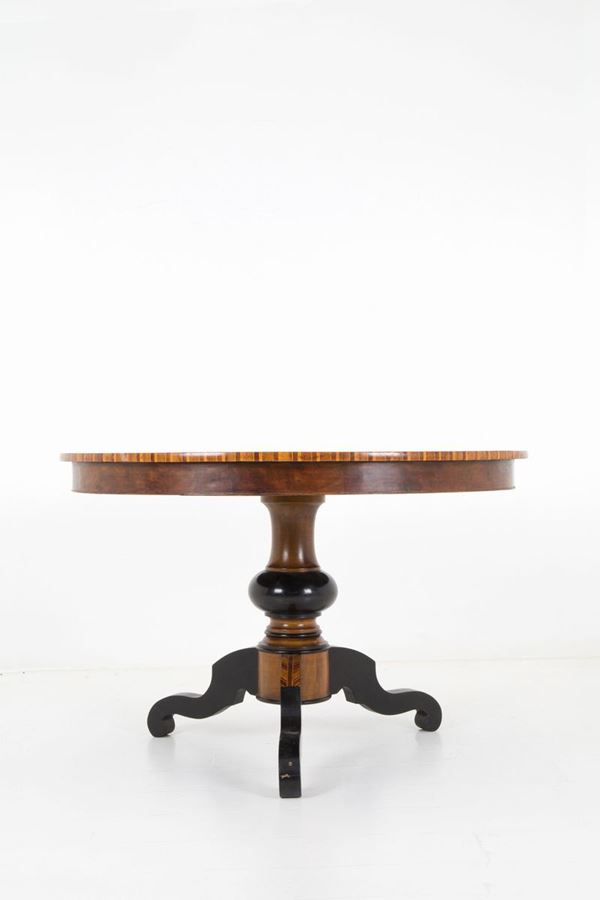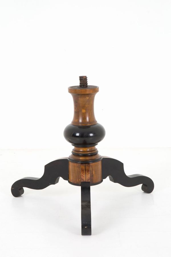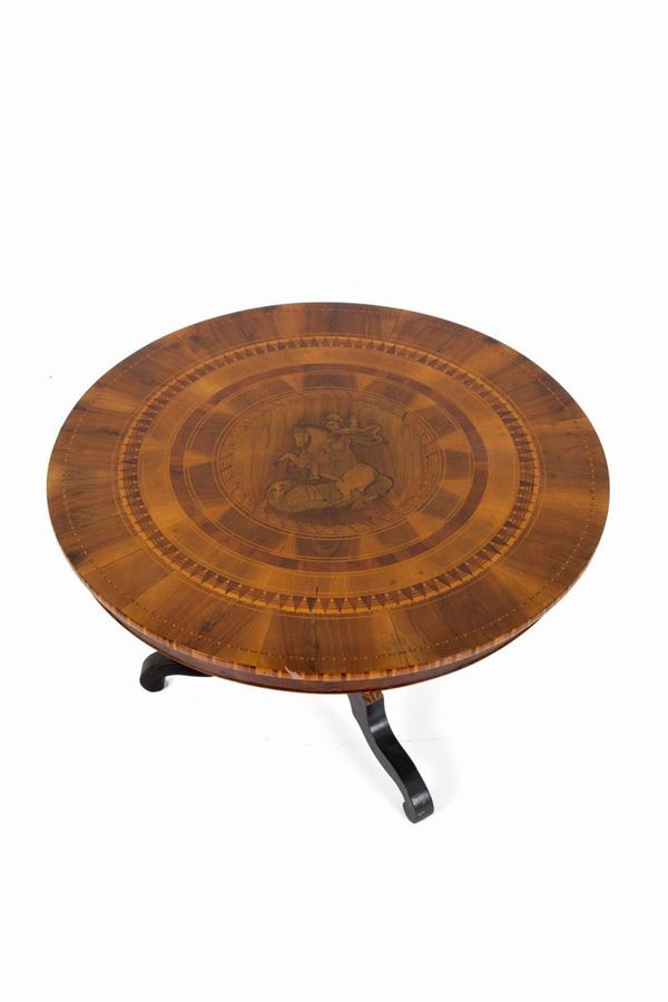 Tavolo rotondo a vela in legno lastronato in legni vari e intarsiato a motivi geometrici con raffigurazione di San Giorgio che sconfigge il drago al centro. Rolo. XIX secolo.