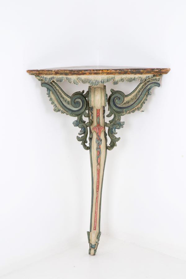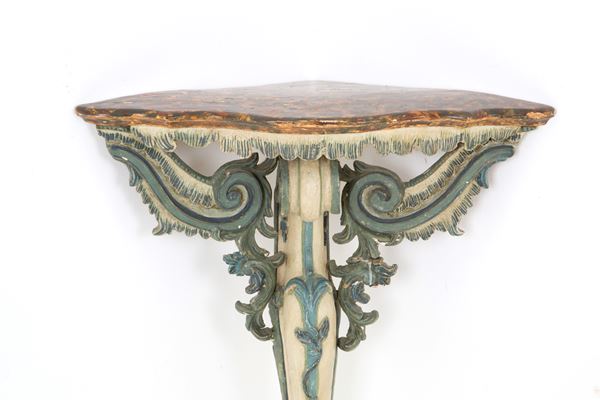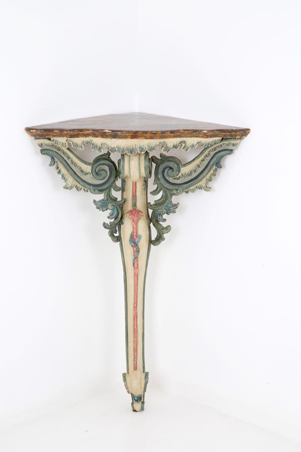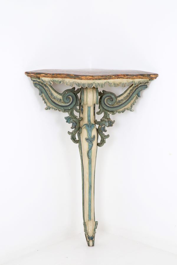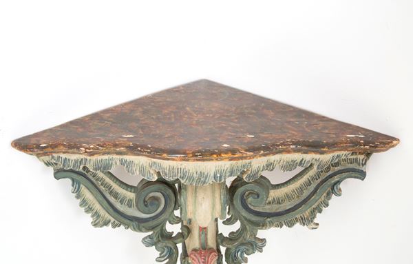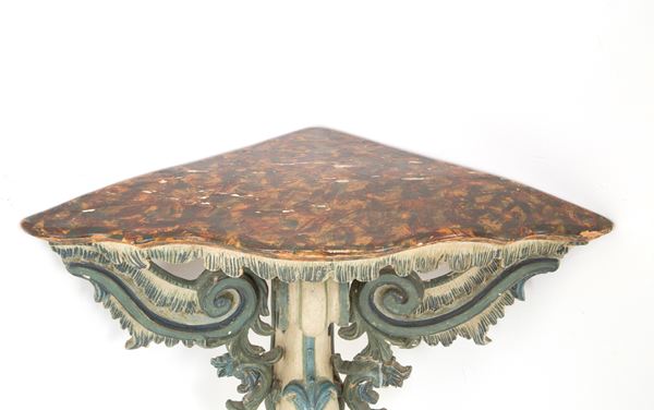 Tre angoliere in legno laccato con piano in finto marmo. Liguria. Inizi XVIII secolo.