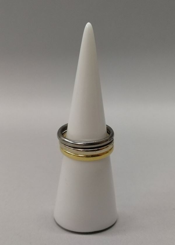 Tre anelli modello Lucciole nei tre colori dell'oro, bianco, giallo e brunito 18kt. impreziositi ognuno da un piccolo diamante taglio brillante rotondo, gr. 6,1 ca. complessivi. Firmati POMELLATO. In astuccio originale. Misura 9 modificabile.