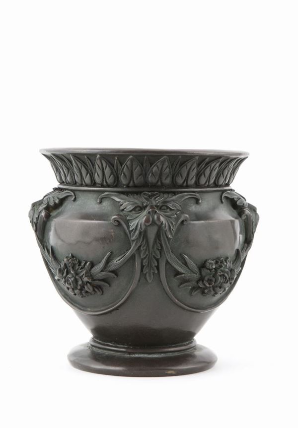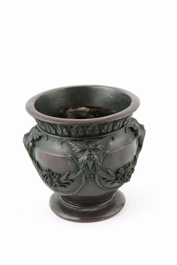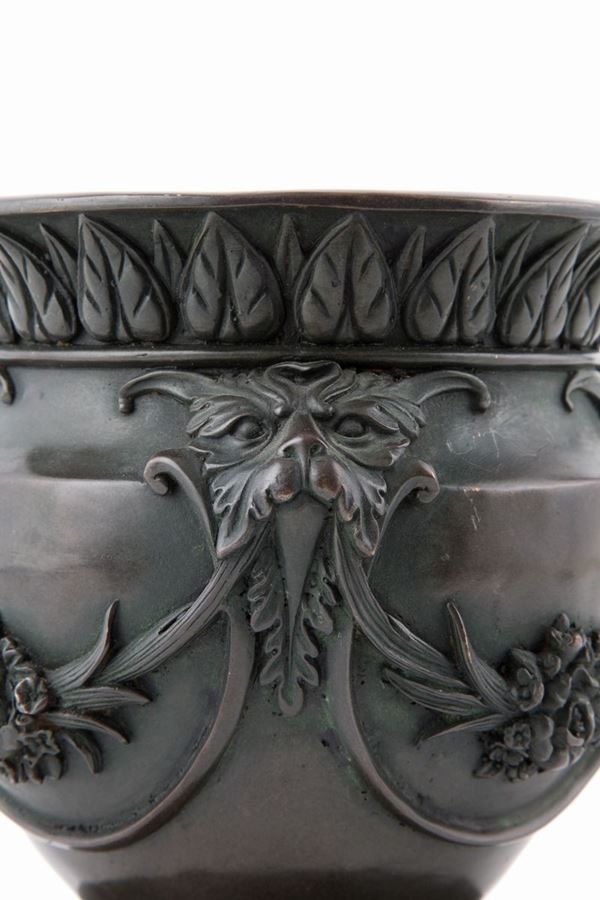 Vaso in bronzo finemente cesellato con mascheroni e ghirlande. XX secolo.
