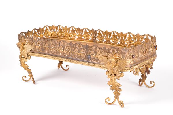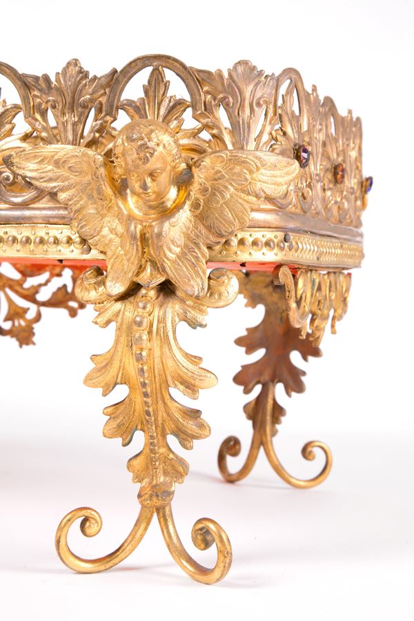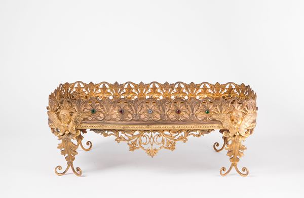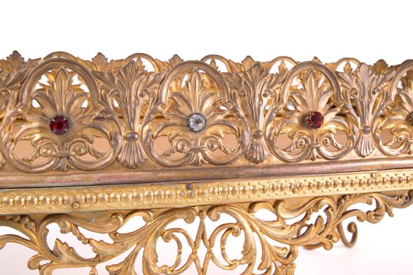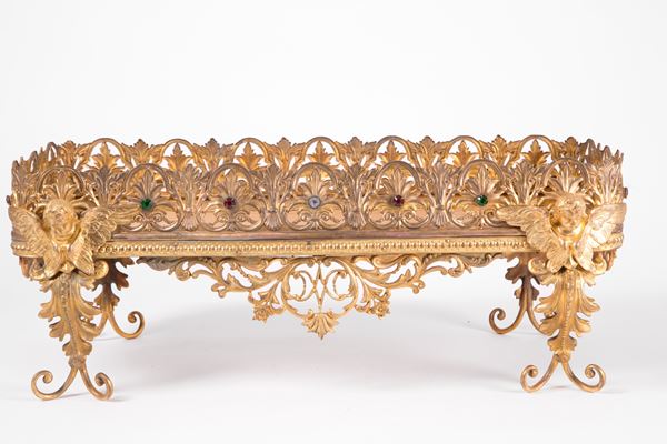 Centrotavola in ottone sbalzato e dorato con vetri colorati. Fine XIX secolo.