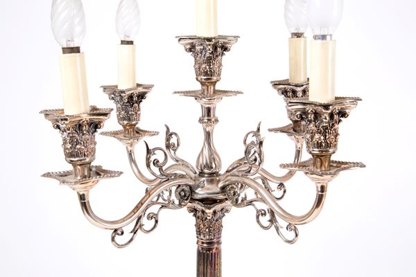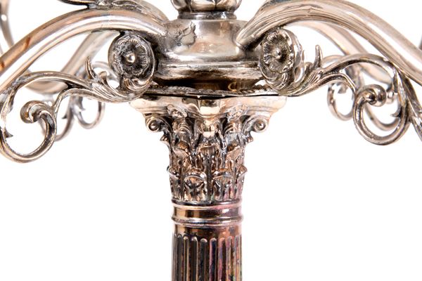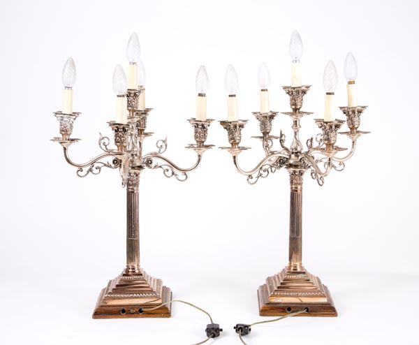 Coppia di candelabri cinque fiamme in metallo. Inizi XX secolo.