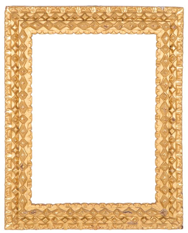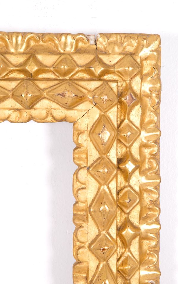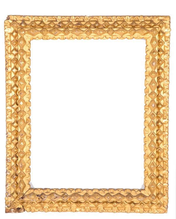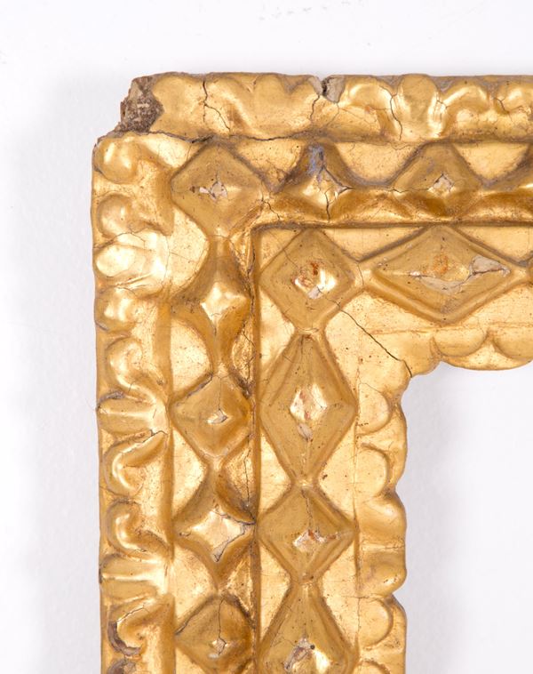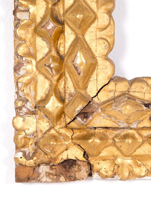 Coppia di cornici in legno intagliato a punta di diamante finemente dorato. XVII secolo.