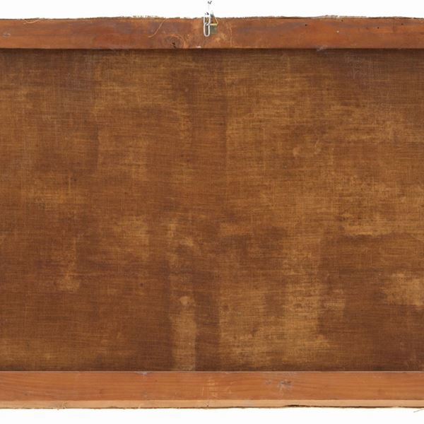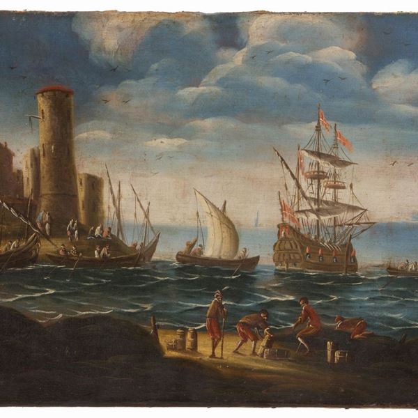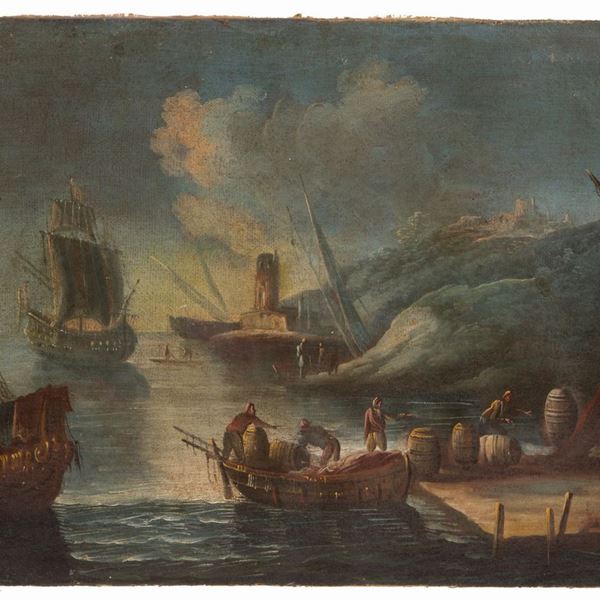 Coppia di dipinti olio su tela raffiguranti "PORTI CON BARCHE E PERSONAGGI". Inizi XVIII secolo.