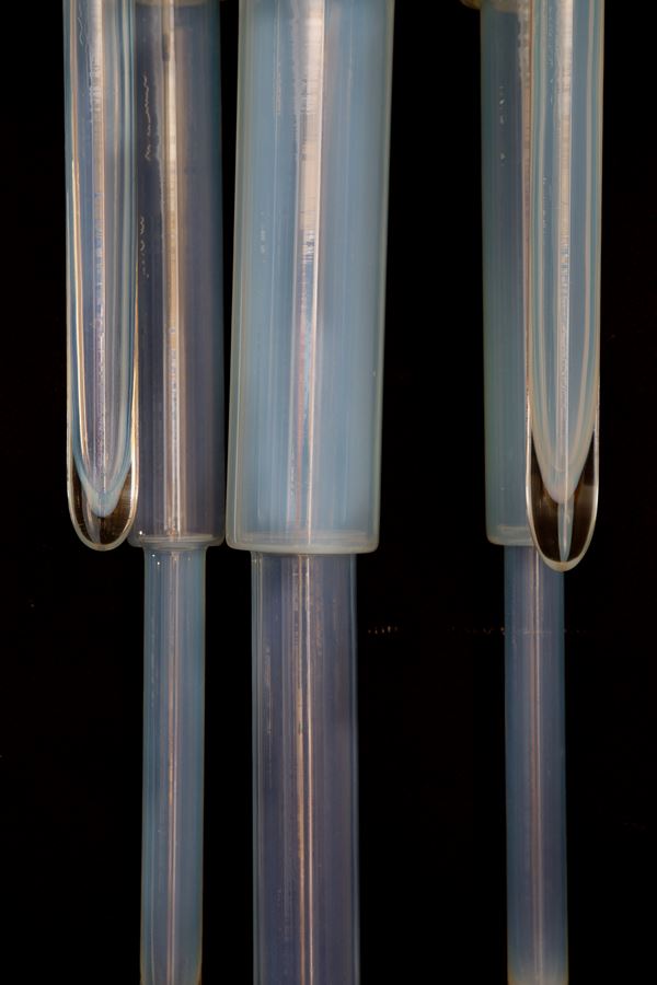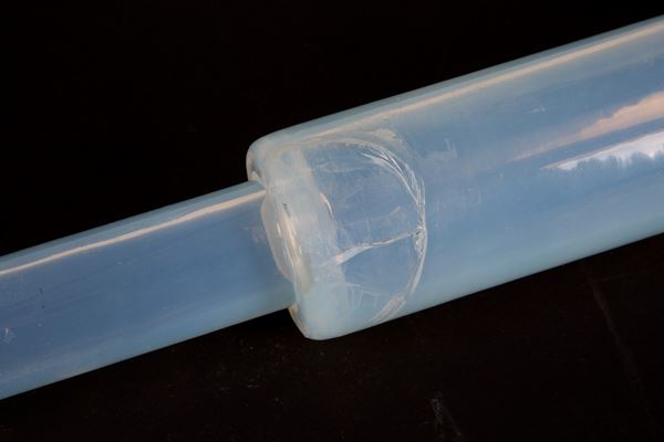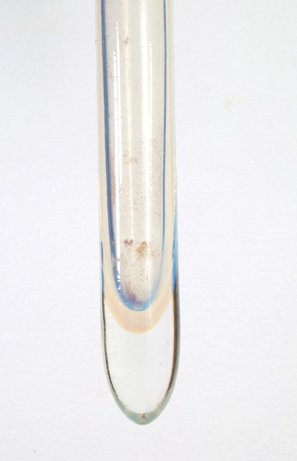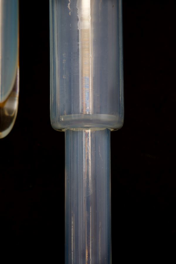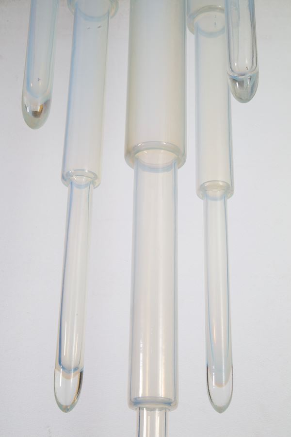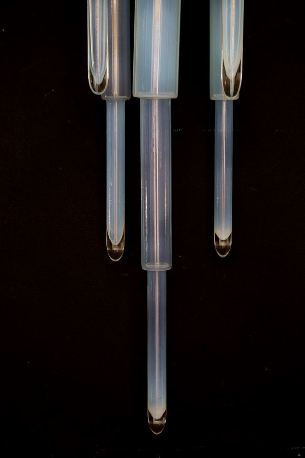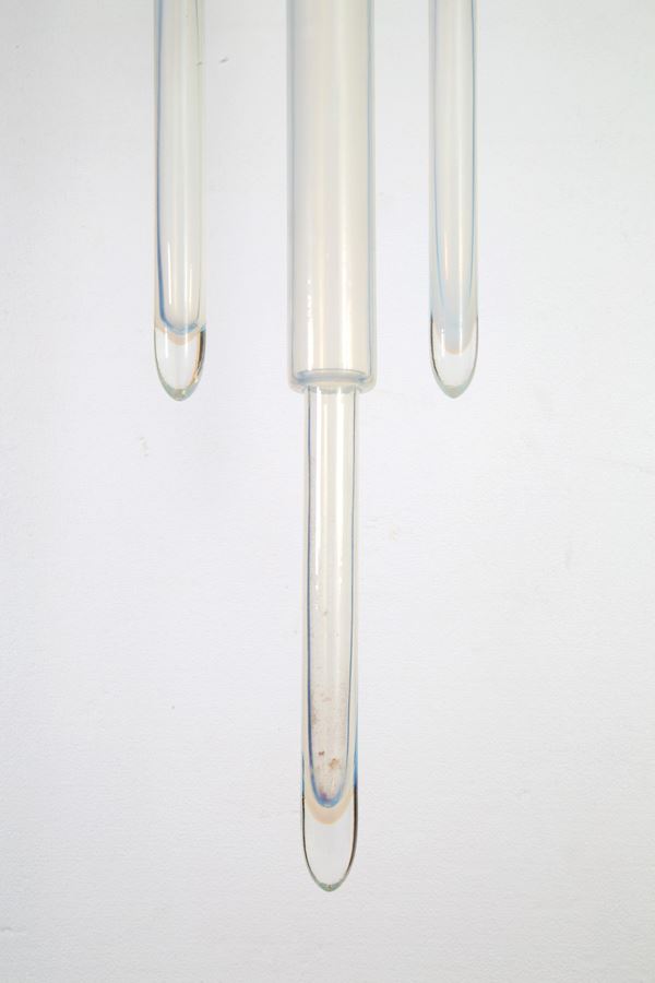 Coppia di plafoniere in vetro opalino bianco e metallo verniciato. Difetti.