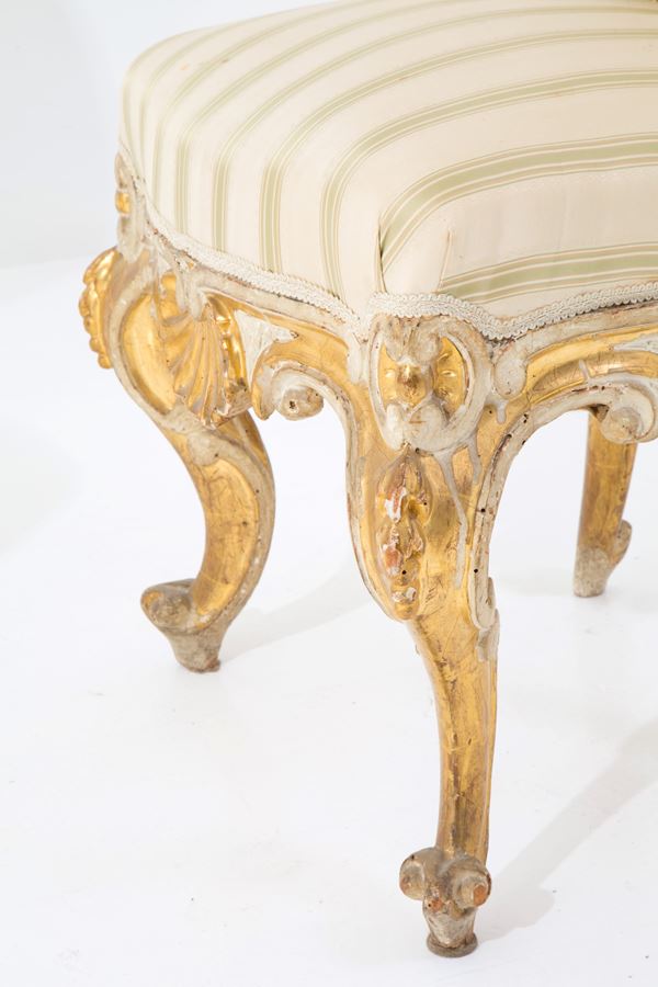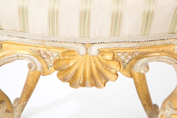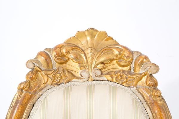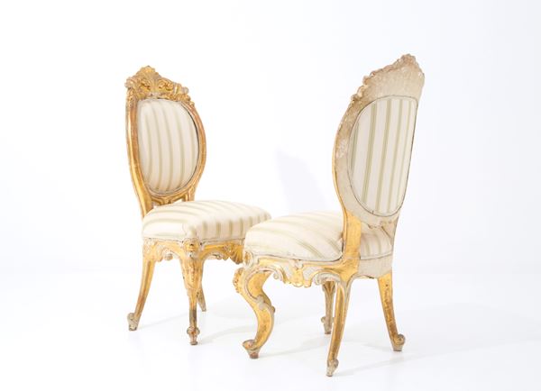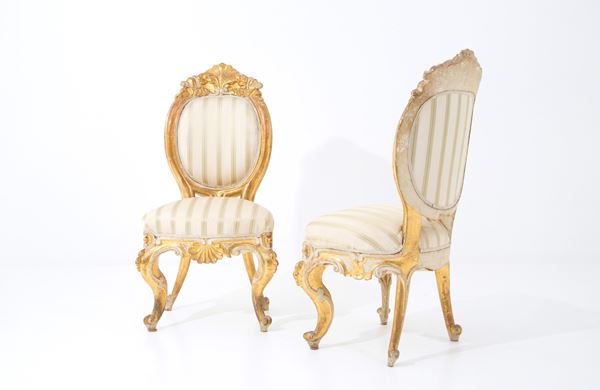 Coppia di sedie finemente intagliate e dorate. Inizi XIX secolo. Difetti.