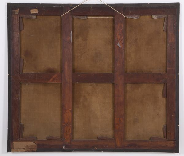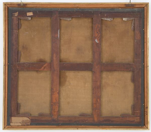 Dipinto olio su tela raffigurante "ESTER SVIENE AL COSPETTO DI ASSUERO". Inizi XVIII secolo. In cornice in legno dorato. Già rintelaiato e rintelato.