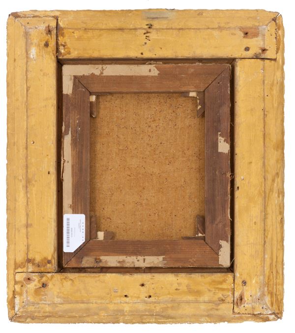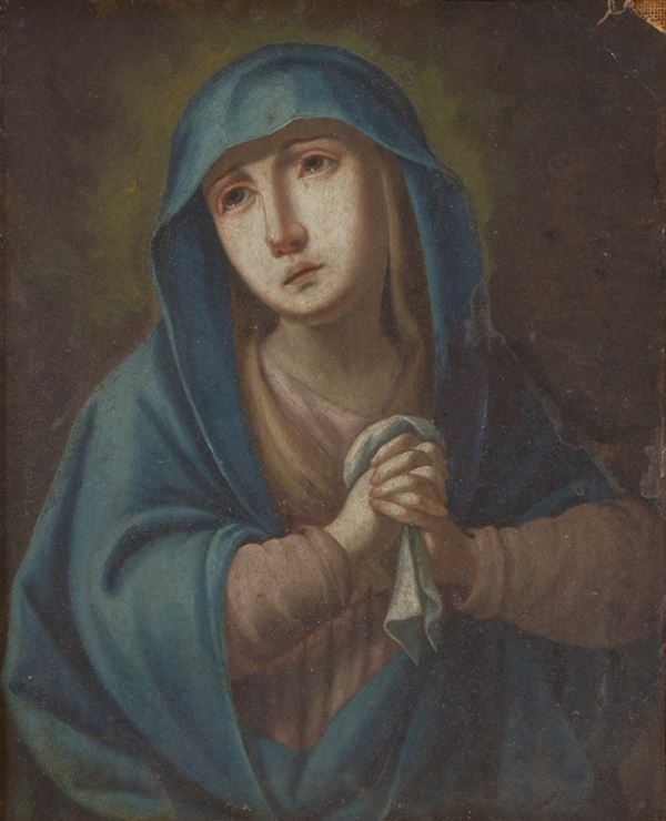 Dipinto olio su carta applicata su tela raffigurante "MADONNA ORANTE". XVIII secolo. In cornice intagliata e dorata. Già rintelato e rintelaiato. Difetti e mancanze.