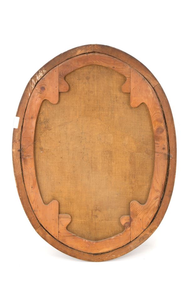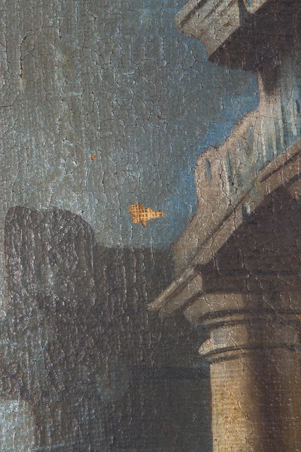 Dipinto ovale olio su tela "MARINA CON ARCHITETTURE E PERSONAGGIO". Inizi XVIII secolo. In cornice coeva. Difetti.