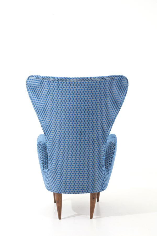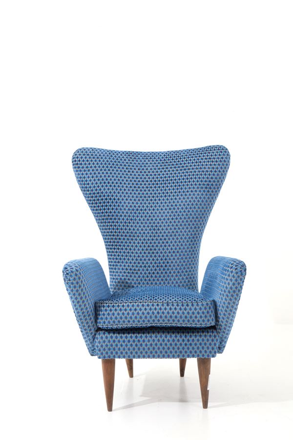 Poltrona in ciniglia blu con gambe di forma conica in legno. Produzione F.LLI GALIMBERTI, Cantù. Anni '50. Pubblicata in Rivista dell'arredamento n. 90, 1962, p. 20.