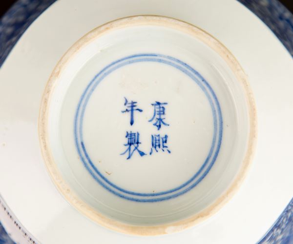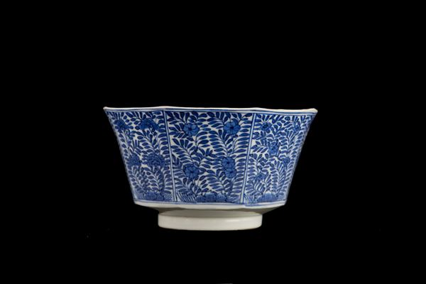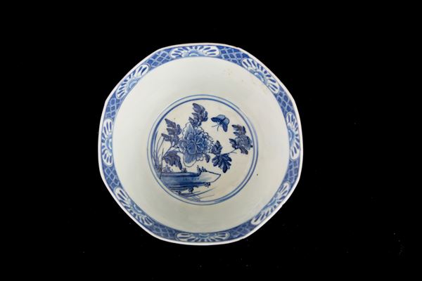 Ciotola in porcellana bianca e blu decorata a motivi floreali. Marcata Kangxi sul fondo. Cina.