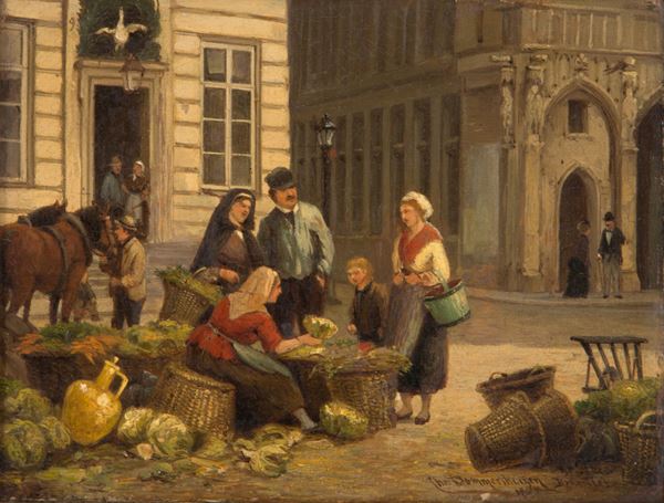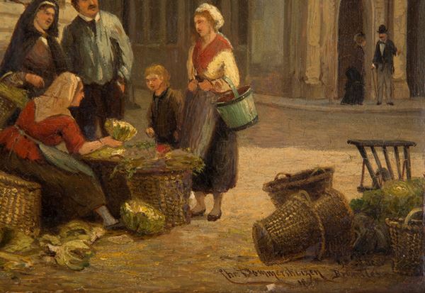 Dipinto olio su tela raffigurante "SCENA DI MERCATO". Firmato e datato CHR. DOMMERSHUIZEN 1875 in basso a destra. In cornice coeva.