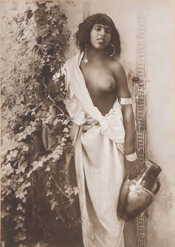 Stampa fotografica vintage "GIOVANE RAGAZZA TUNISINA". 1910. Timbro dei fotografi in basso a destra e marchio sul retro.