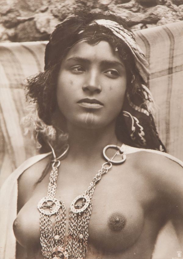 Stampa fotografica vintage "GIOVANE RAGAZZA TUNISINA". 1910. Timbro dei fotografi in basso a destra e marchio sul retro.