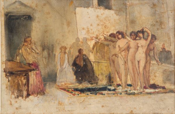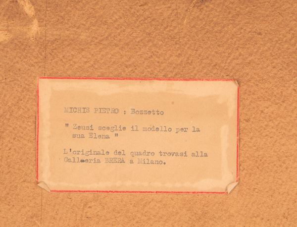 Bozzetto su carta raffigurante "ZEUSI SCEGLIE IL MODELLO PER LA SUA ELENA". In cornice. Difetti. Bozzetto per il dipinto olio su tela realizzato nel 1868-1869 per il Concorso Canonica e conservato alla Pinacoteca di Brera di Milano.