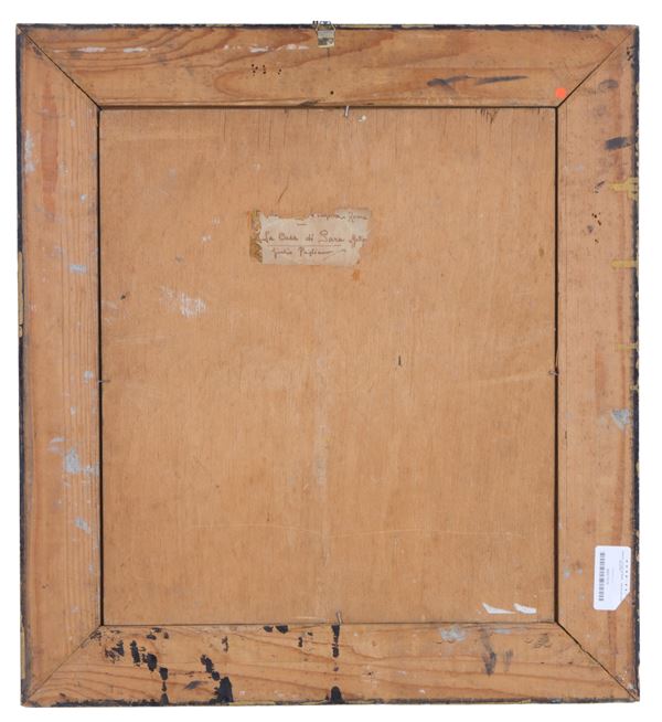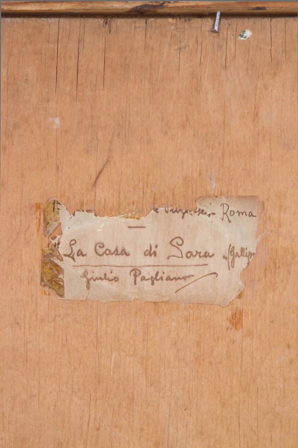 Dipinto olio su tavola intitolato "LA CASA DI SARA, GALLIPOLI". Firmato in basso a destra. Con cartiglio sul retro. In cornice.