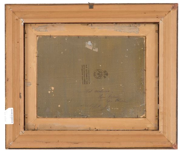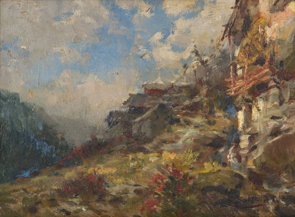 Dipinto olio su cartone intitolato "VAL MALENCO". Firmato in basso a destra. Controfirmato, intitolato e con timbro del premio Esposizione piccole industrie, Como, 1922 sul retro. In cornice.