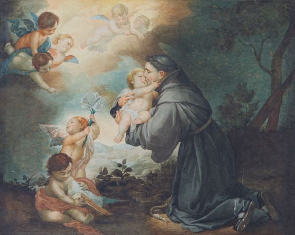 Acquarello su carta applicata su cartone intitolato "SANT'ANTONIO DA PADOVA E ANGELI". Fine XIX secolo. In cornice.
