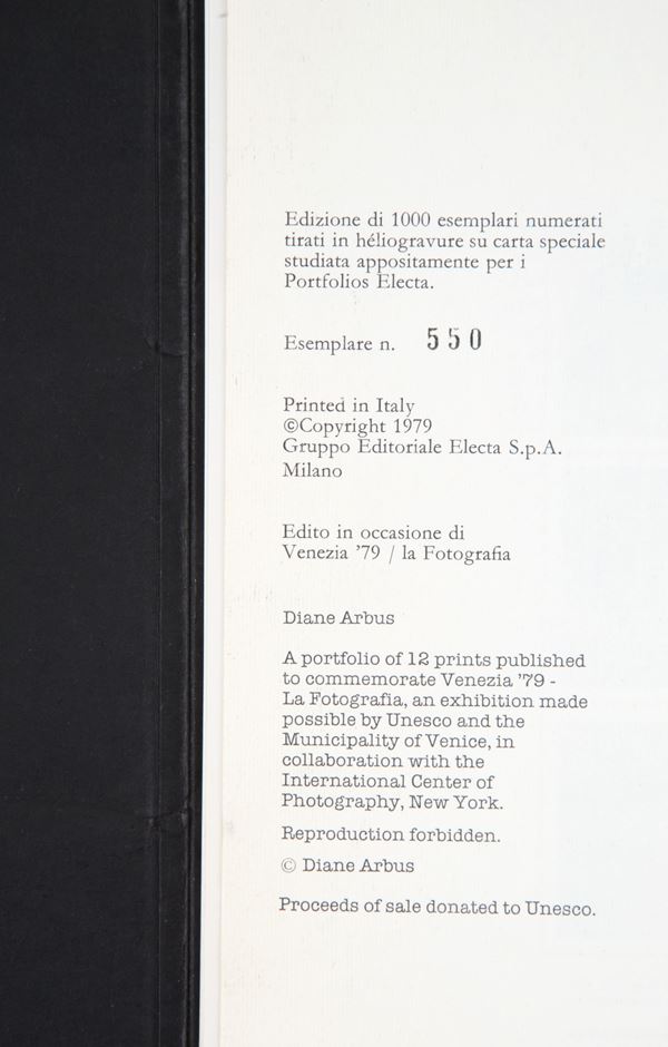 Portfolio 12 Heliogravure. Stampate nel 1979 a cura di Electa in cartelletta originale. Realizzate per la mostra Diane Arbus a palazzo Fortuny. Edizione 667 di 1000.