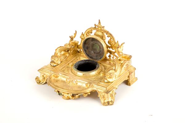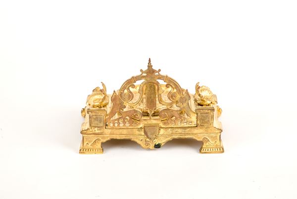 Calamaio in bronzo cesellato e dorato con tritoni. Inizi XX secolo.