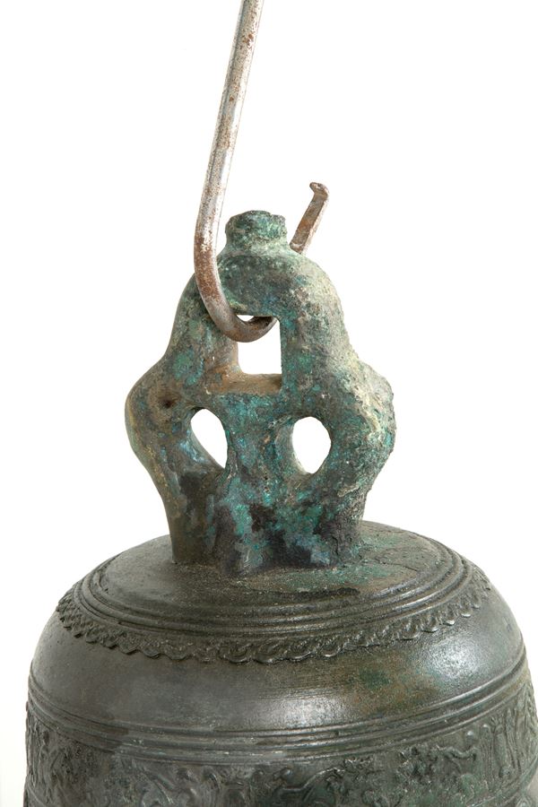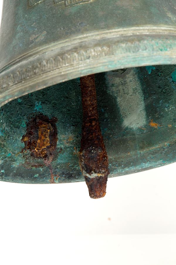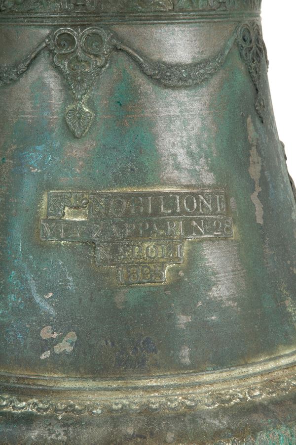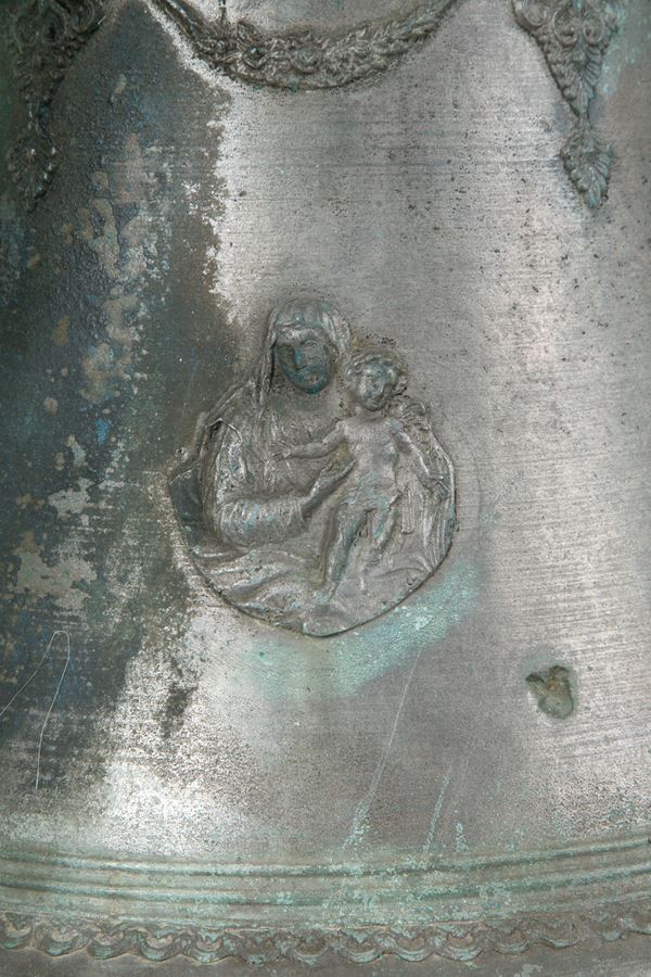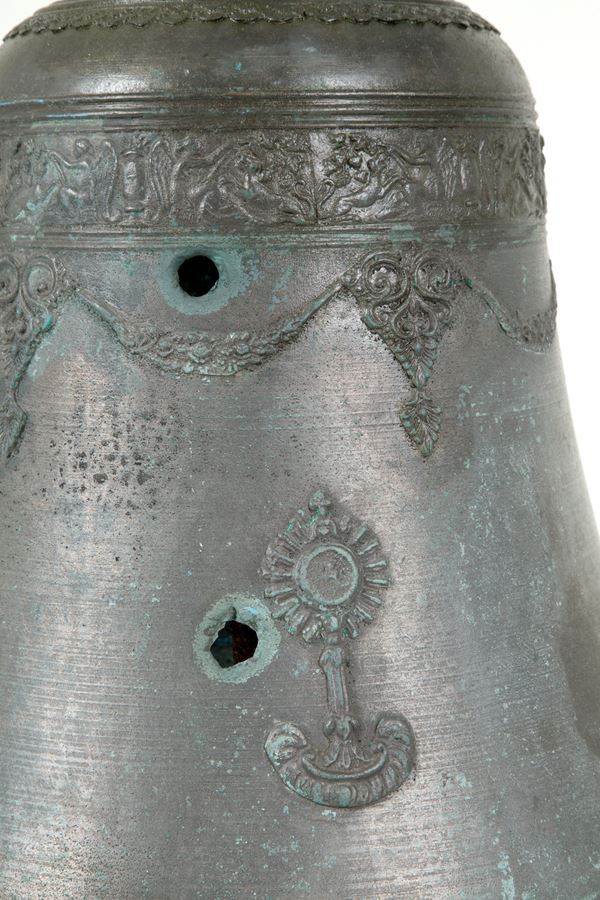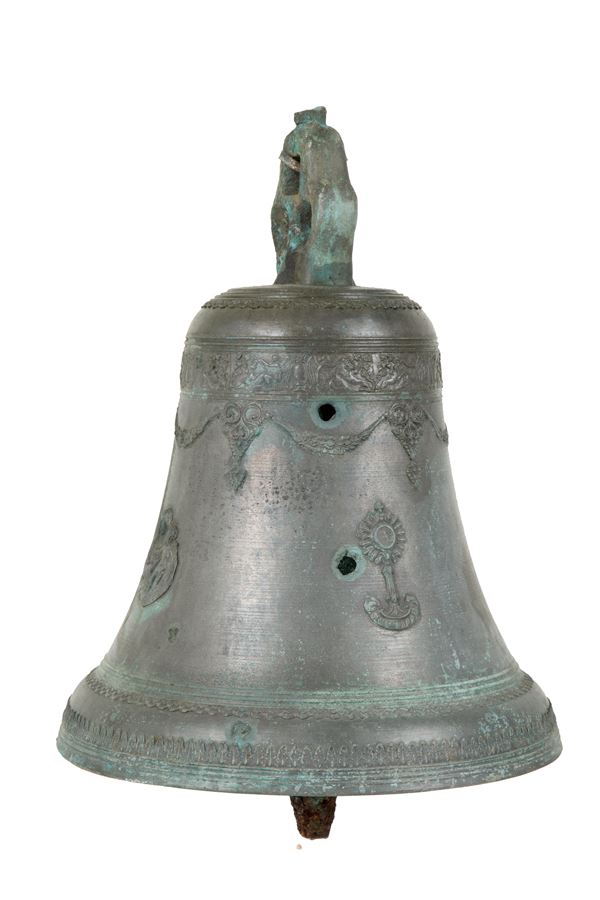Campana in bronzo decorata con fascia a festoni, immagine della Madonna e il Bambino e con l'Ostensorio. Firmata SALVATORE NOBILIO, Napoli 1895 sul retro. Presenta due fori.