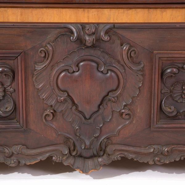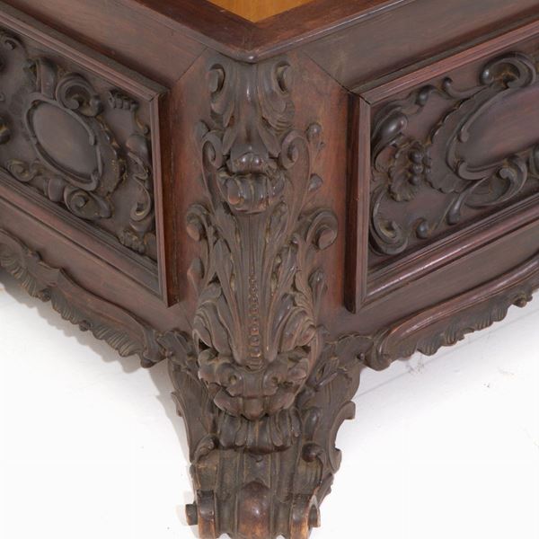 Cassapanca in legno di noce finemente intagliato. XIX secolo.