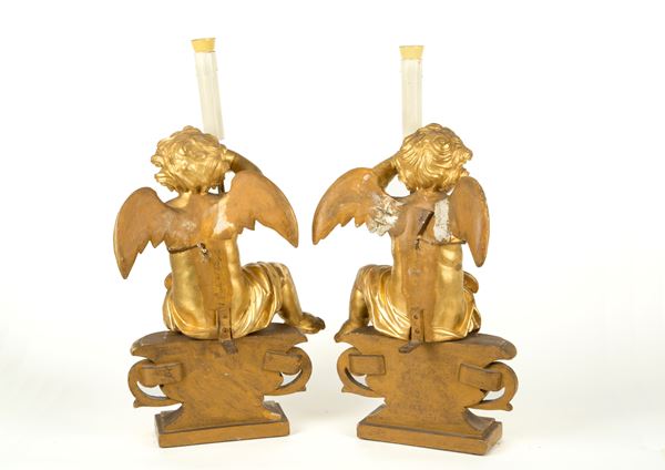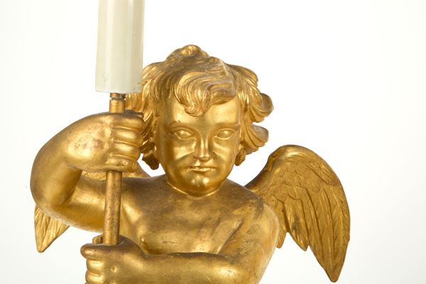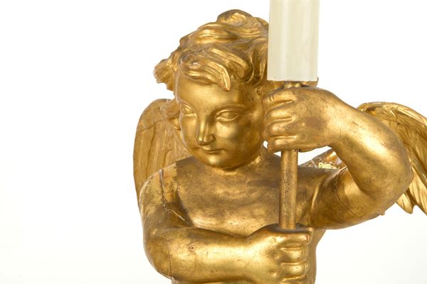 Coppia di reggicero a forma di angelo montate a lampada in legno intagliato e dorato. Basi a forma di coppe ansate. XIX secolo. Difetti.