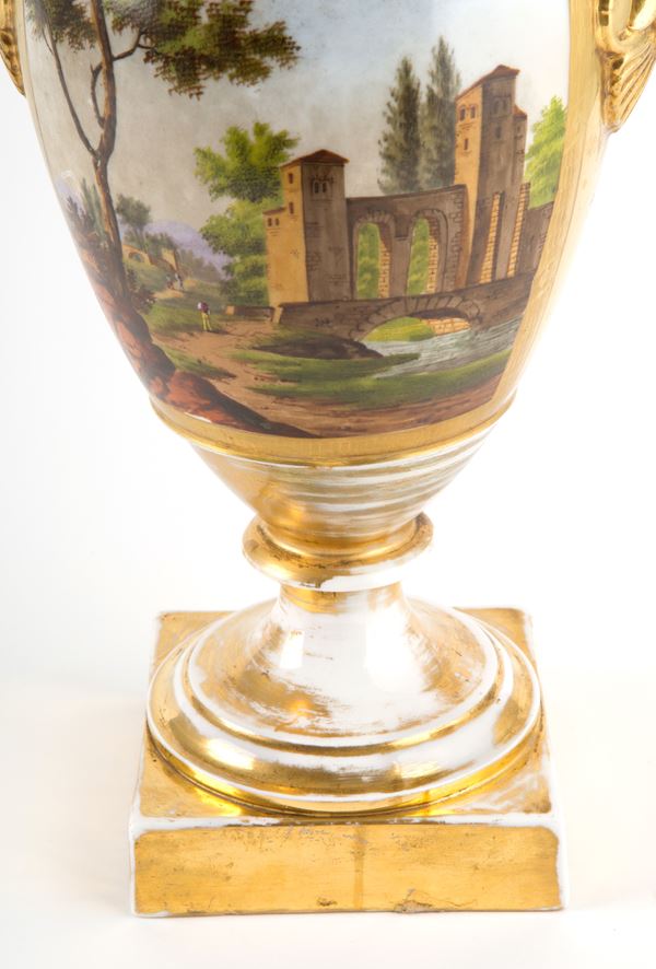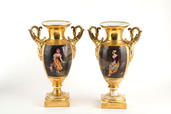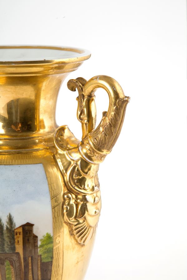 Coppia di vasi in porcellana dorata e dipinta. Inizi XIX secolo.