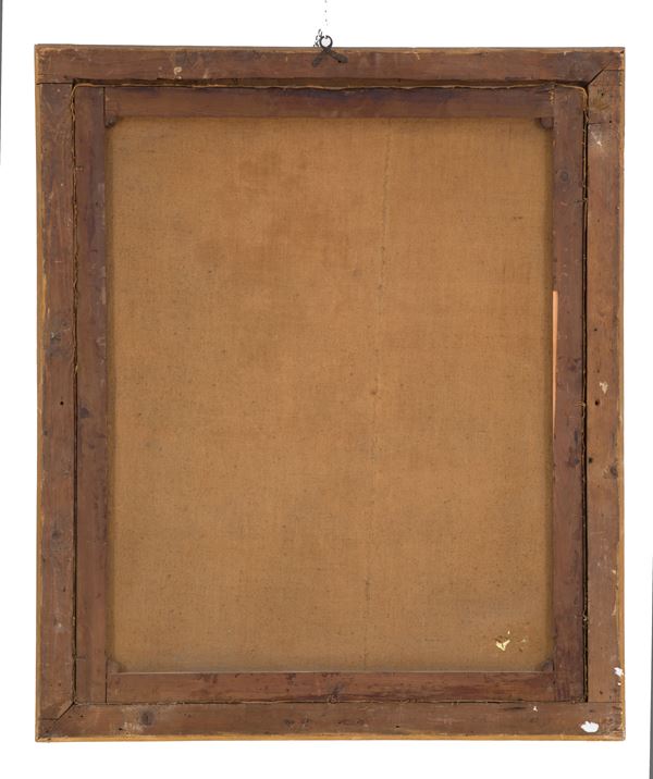 Dipinto olio su tela raffigurante "DEPOSIZIONE". XVII secolo. In cornice dorata. Difetti.