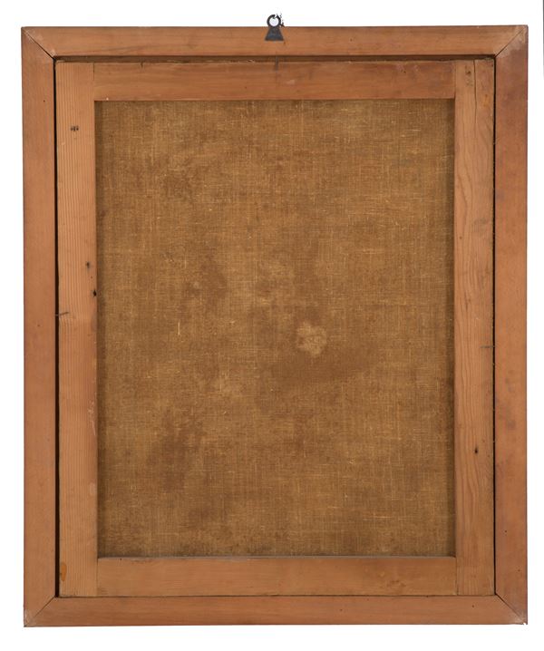Dipinto olio su tela raffigurante "DUE PERSONAGGI A TAVOLA". Fine XVII secolo. In cornice. Già rintelato e rintelaiato. Difetti.