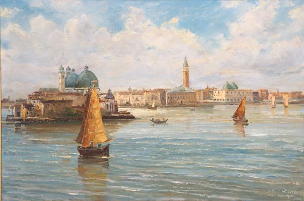 Dipinto olio su tela raffigurante "VEDUTA DEL BACINO DI SAN MARCO". Firmato in basso a destra. In cornice dorata.