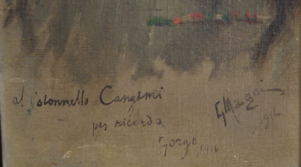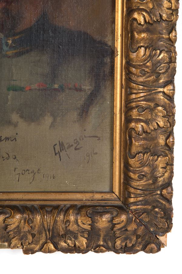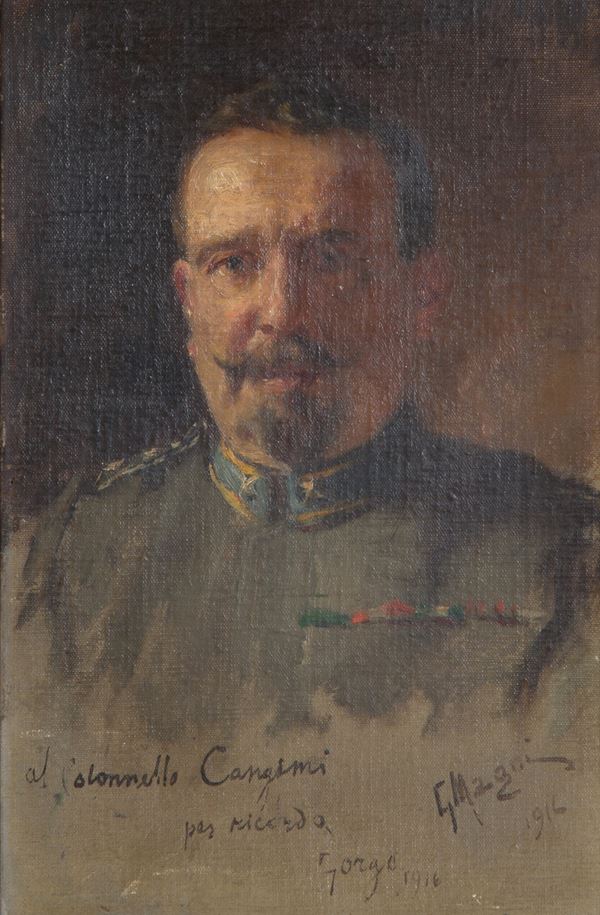 Dipinto olio su tela applicata su cartone raffigurante "IL COLONNELLO CANGEMI". Firmato e datato 1916 in basso a sinistra. In cornice.