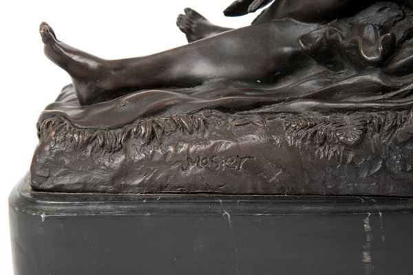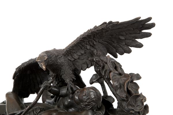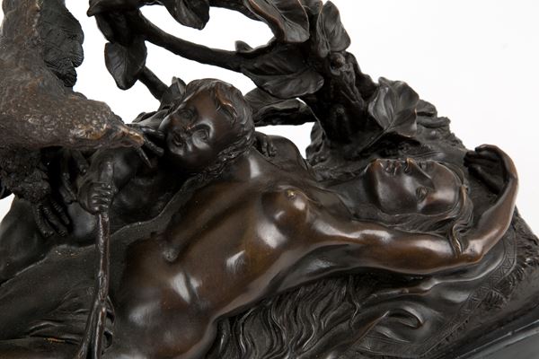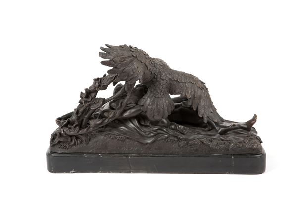Scultura in bronzo raffigurante "DONNA CON AQUILA E BAMBINO". Firmata in basso a sinistra. Base in marmo nero.