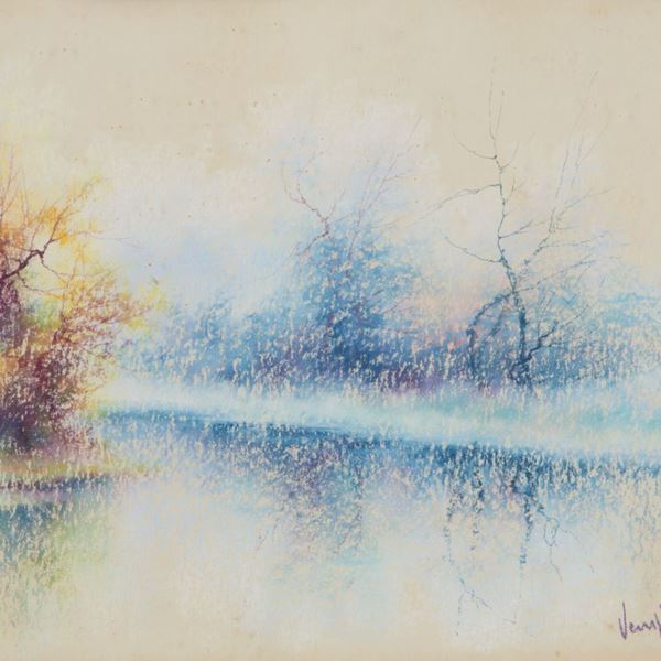 Pastello su carta raffigurante "SCORCIO DI LAGO". Firmato in basso a destra. In cornice.