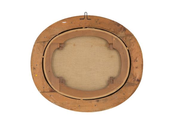 Dipinto ovale olio su tela raffigurante "PAESAGGIO CON FIGURE". In elegante cornice intagliata a motivi floreali. Già rintelato e rintelaiato.