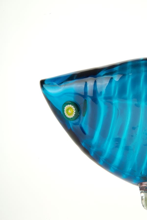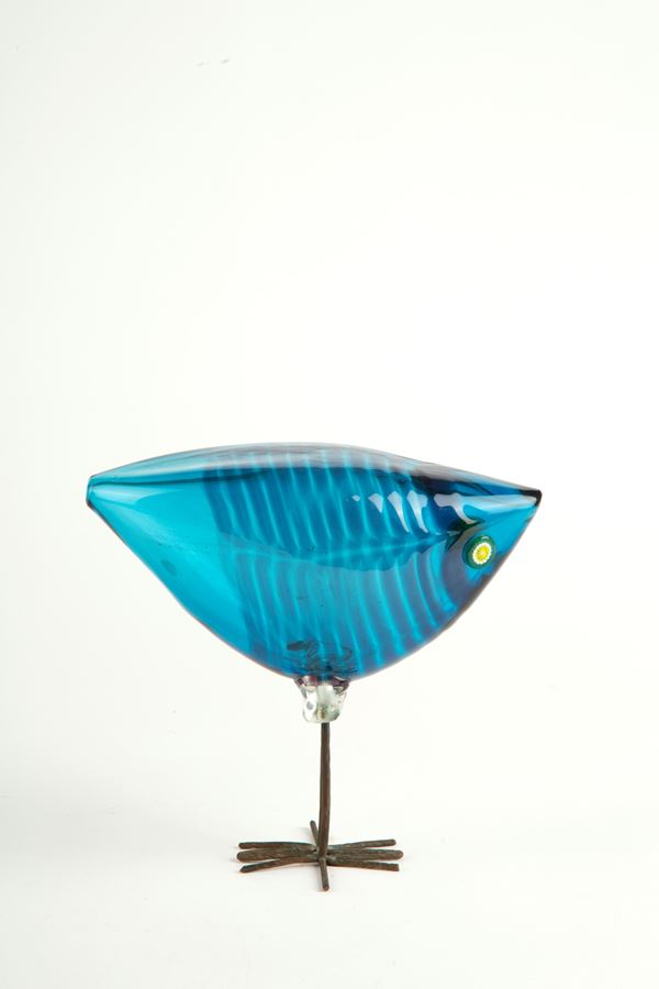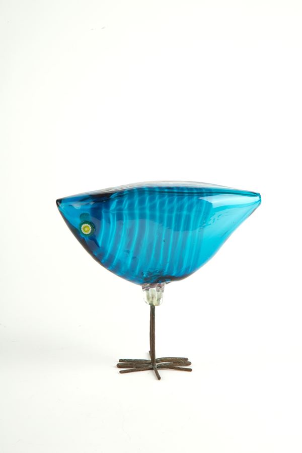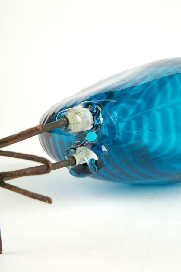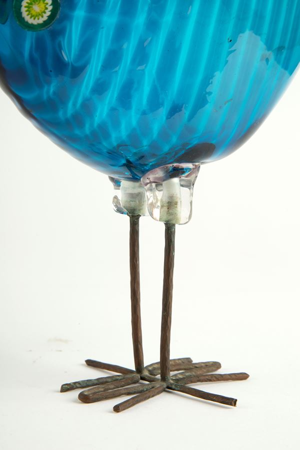 Scultura in vetro soffiato e striato blu raffigurante “PULCINO”. Zampette in rame e occhi a murrina applicati a caldo. Produzione VISTOSI. Murano. 1964 ca.
