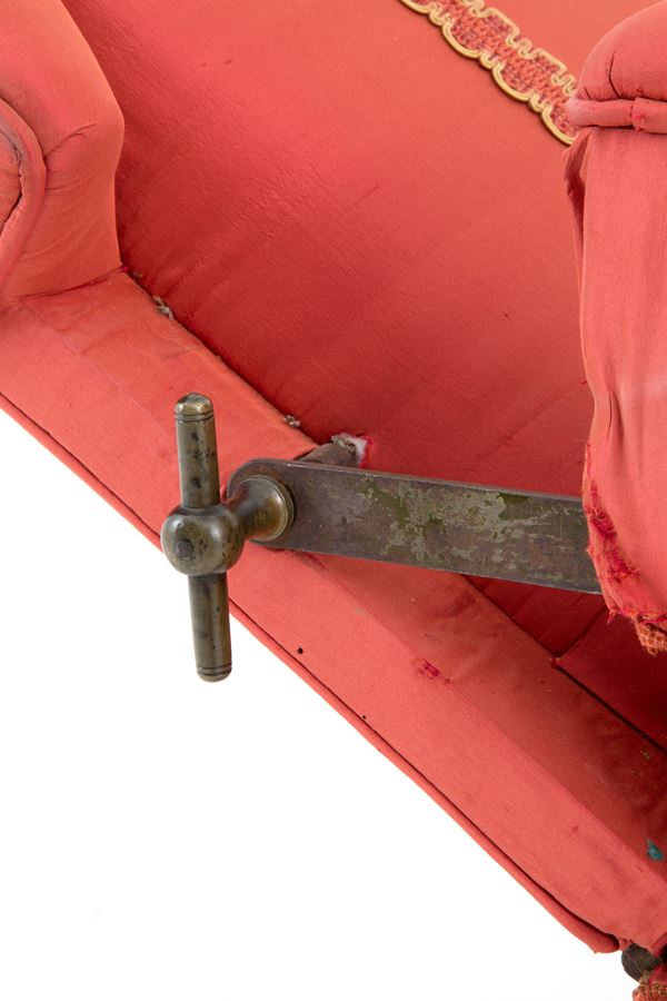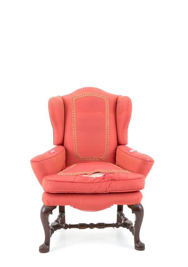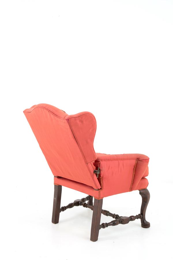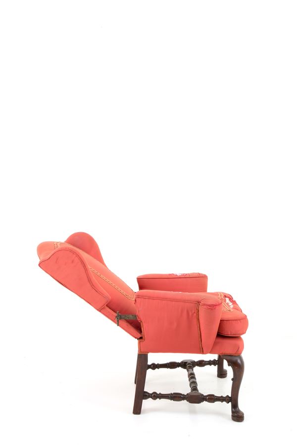 Poltrona ad orecchioni in noce imbottita in raso rosa e schienale con meccanismo reclinabile. Venezia. Fine XIX secolo. Difetti.