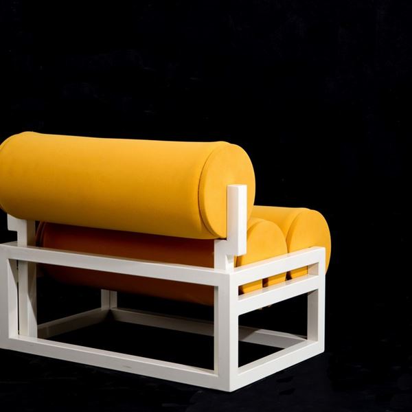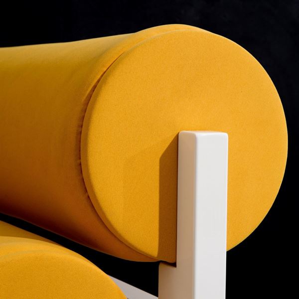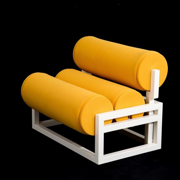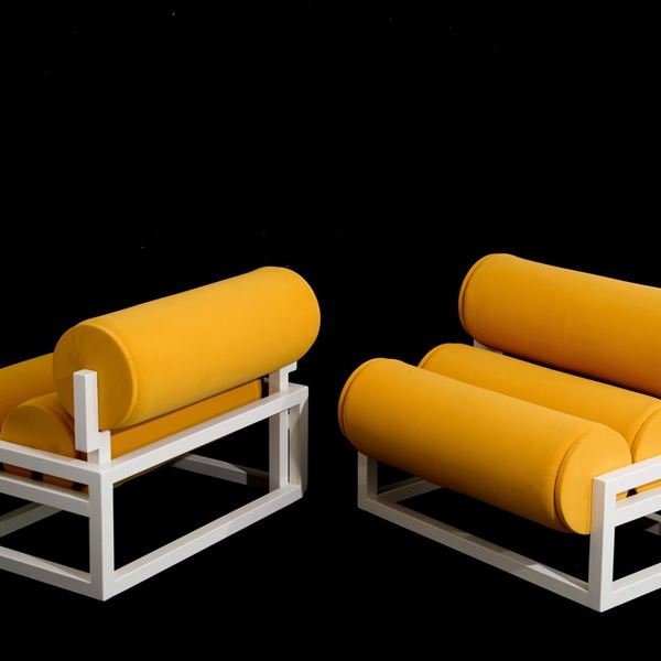 Coppia di poltrone in metallo verniciato bianco e tessuto giallo. Anni 70. Pubblicate in Carla De Benedetti, Interiors '70, Verba Volant, Firenze 2008.