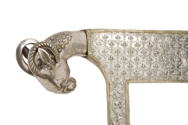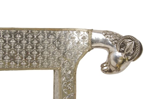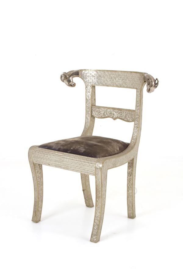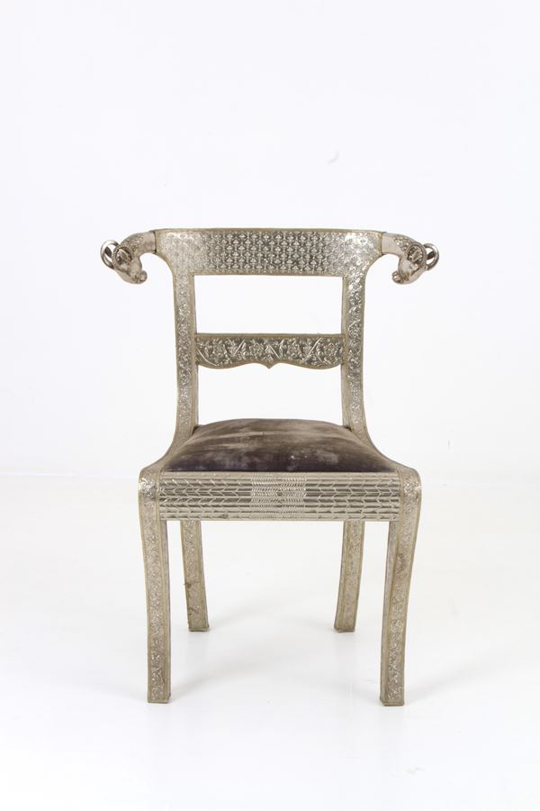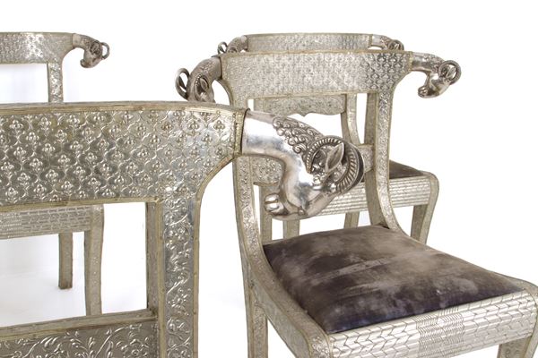 Sei sedie rivestite in metallo sbalzato e argentato decorato con teste caprine sullo schienale. XIX secolo.