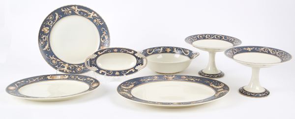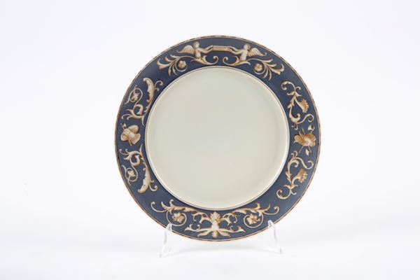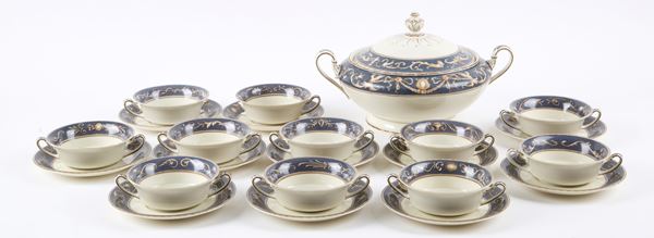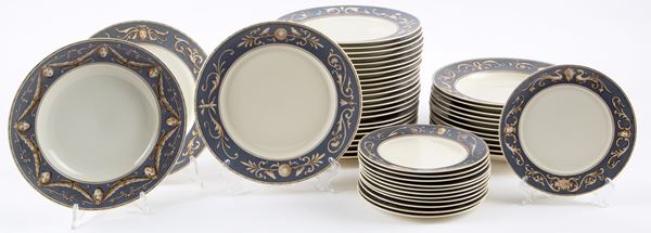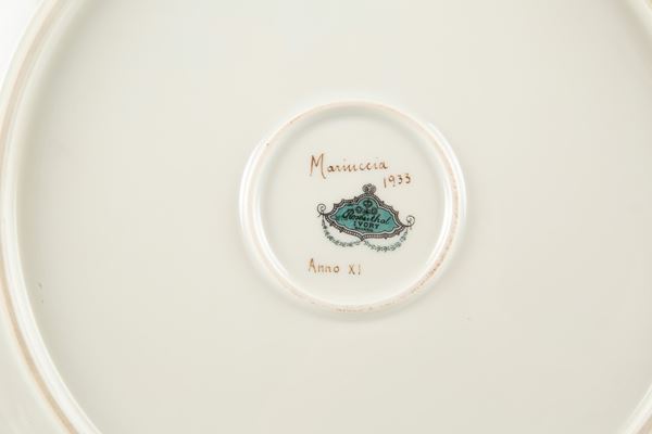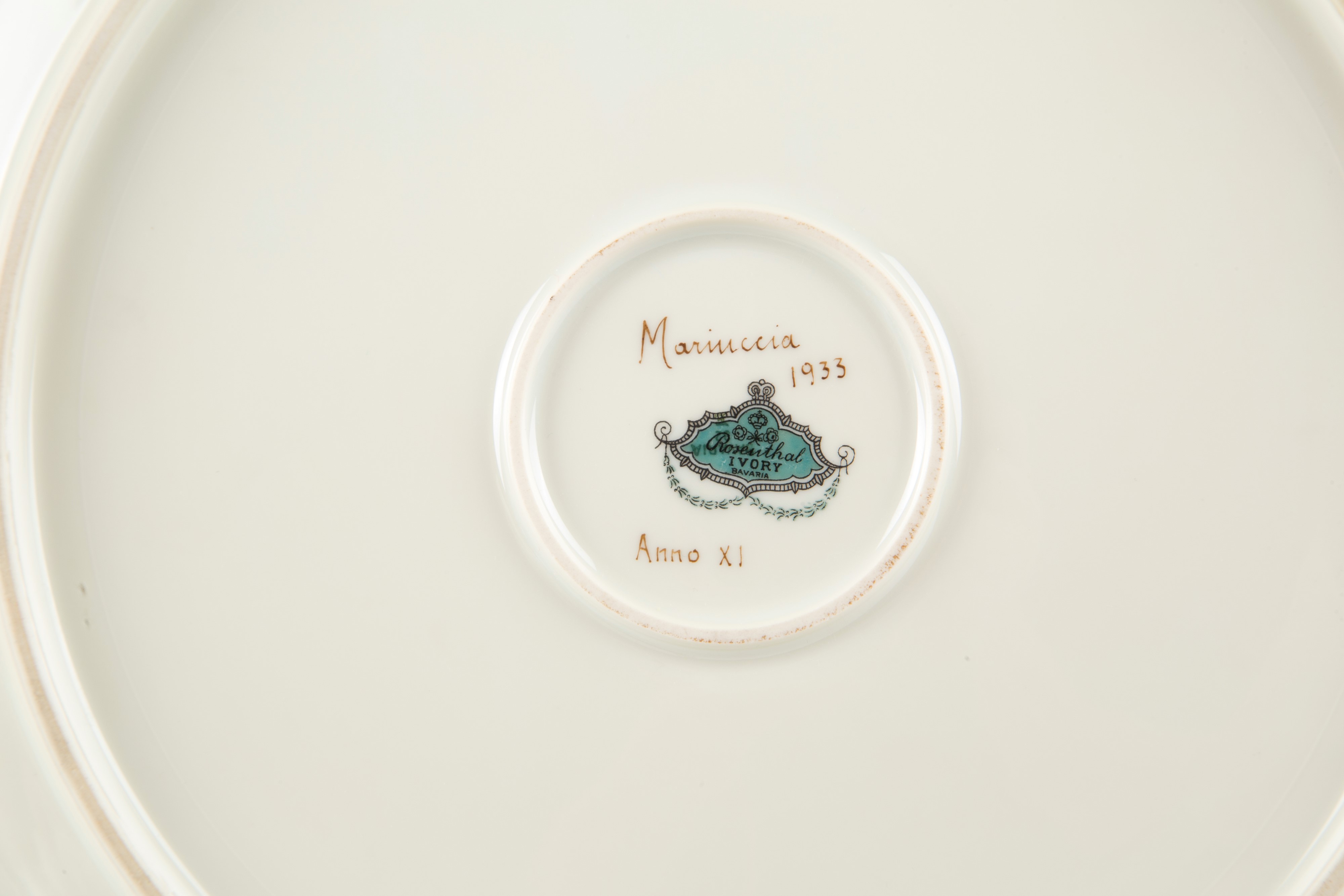 Servizio di piatti in porcellana composto da ventiquattro piatti piani, dodici piatti fondi, dodici piattini, undici tazze da brodo con piattini, due alzatine, tre piatti da portata, una zuppiera con coperchio, una insalatiera e due salsiere. Manifattura ROSENTHAL. Alcuni firmati Mariuccia 1933, anno XI. Una tazza con manico rotto.