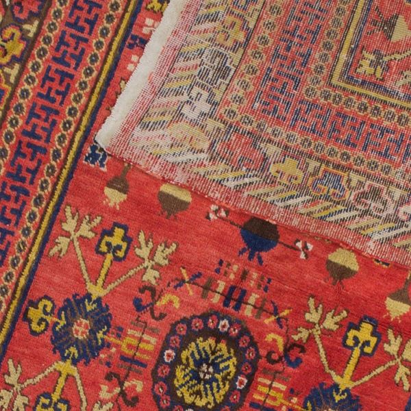 Tappeto Khotan. Turkestan Orientale. Inizi XX secolo. Ottimo stato di conservazione con piccoli vecchi restauri sul campo. Pubblicato sul libro Masterpieces from The-Te-Chun Wang Collection.