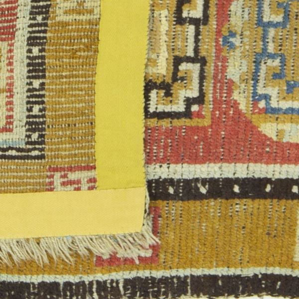 Tappeto Tibet a tre medaglioni. Fine XIX secolo. Segni di usura, non presenta vecchi restauri.