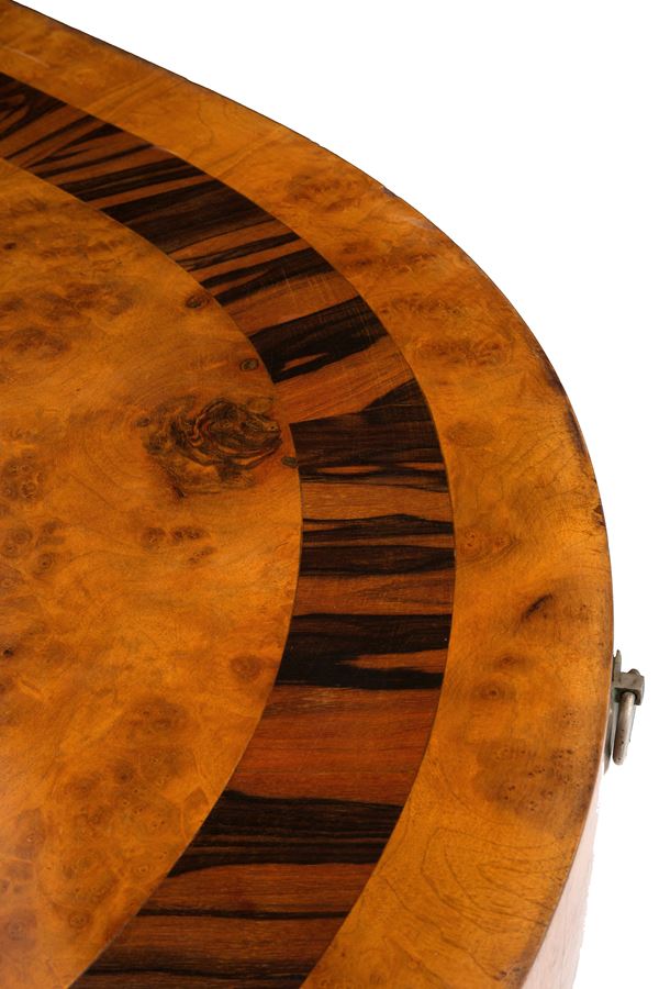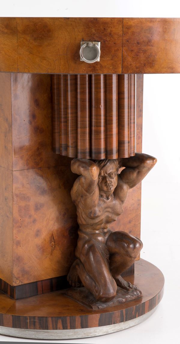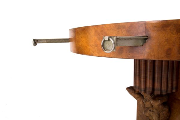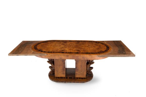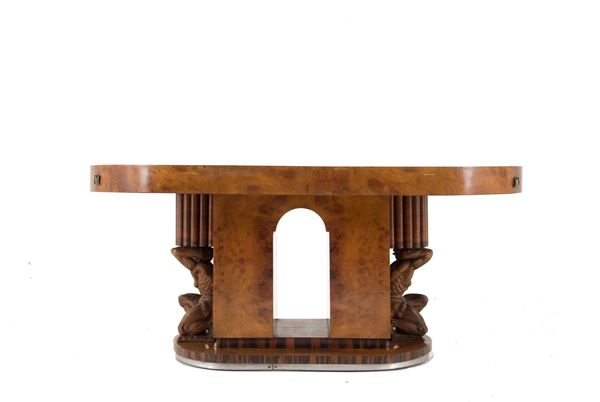 Tavolo ovale allungabile lastronato in legni vari sorretto da due figure virili. Circa 1930. Usure del tempo.