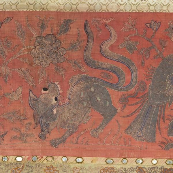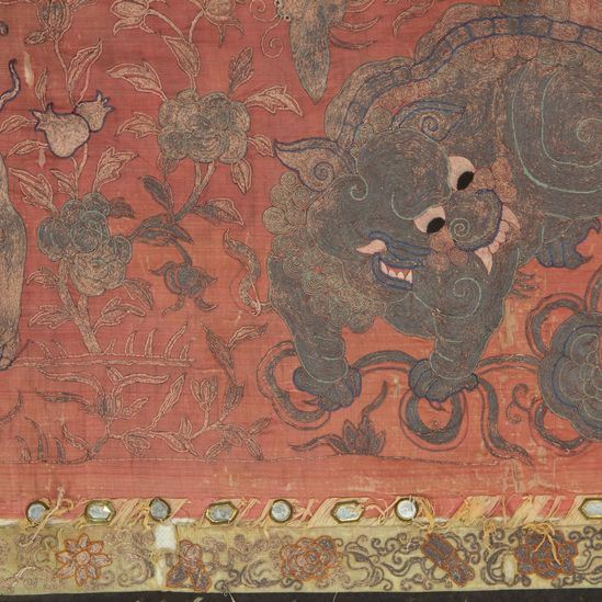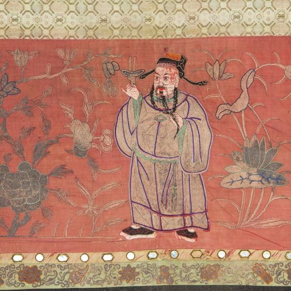 * Tessuto in seta e fili metallici. Cina. Inizi XX secolo. Ottimo stato di conservazione, le frange della parte bassa sono originali.