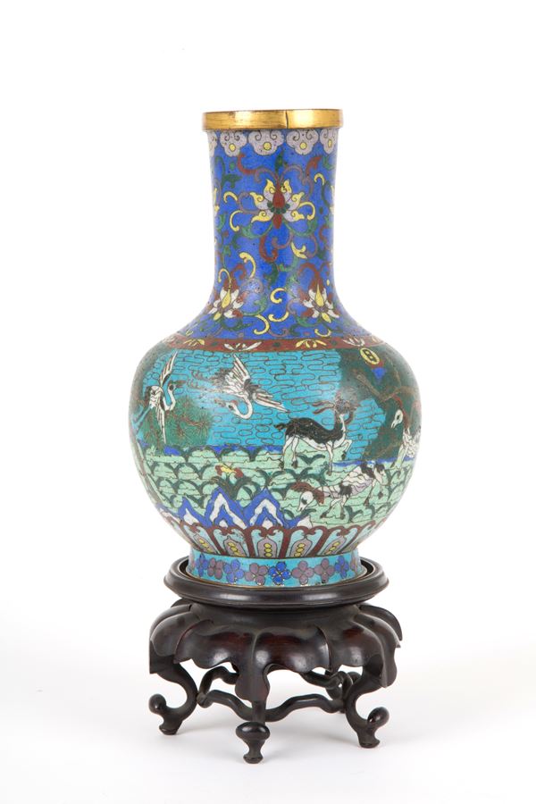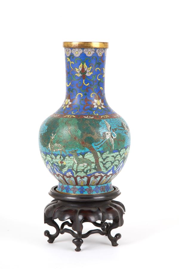 Vaso cloisonné con fiori e animali. Base in legno. Cina. Periodo Jiangqing (1796-1820).