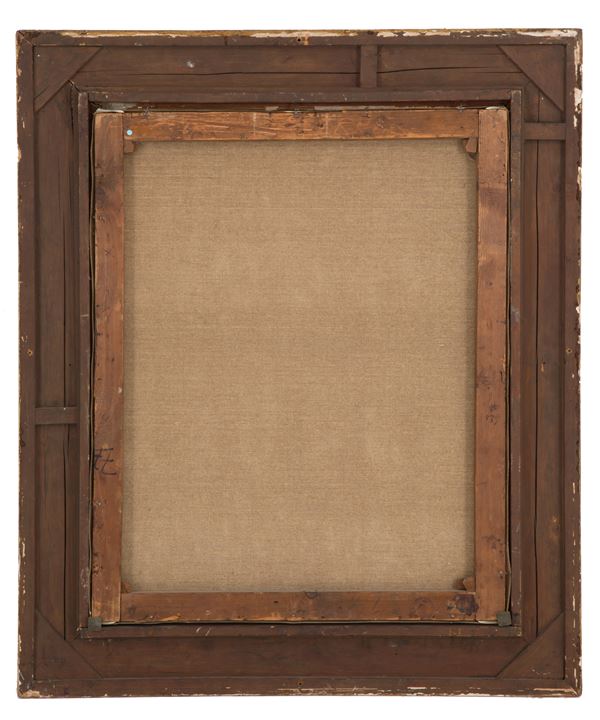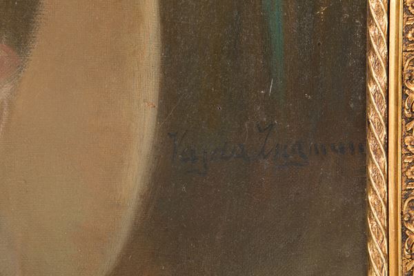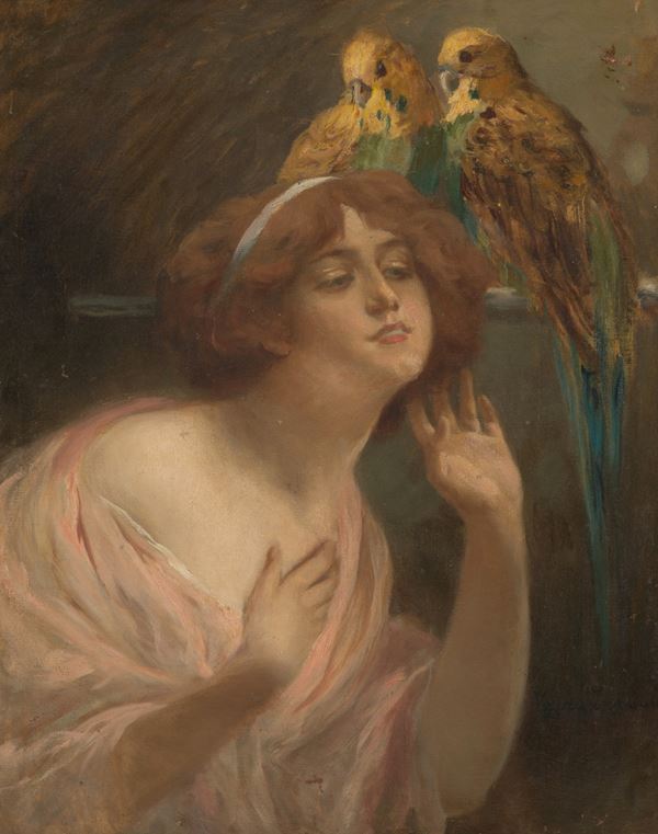 Dipinto olio su tela raffigurante "DONNA CON PAPPAGALLI". Firmato in basso a destra. In cornice dorata. Lievi restauri.