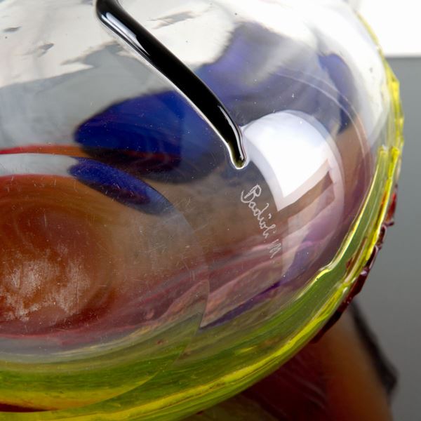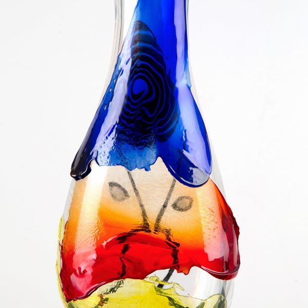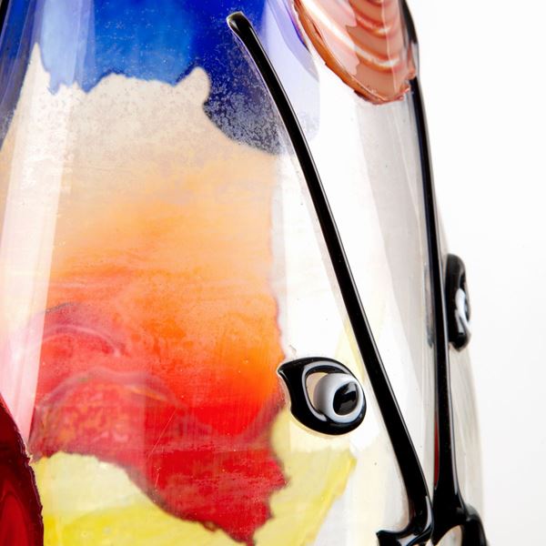 Vaso in vetro di Murano con decorazioni multicolori applicate a caldo raffiguranti volti di profilo e spirale. Firmato in basso a destra.