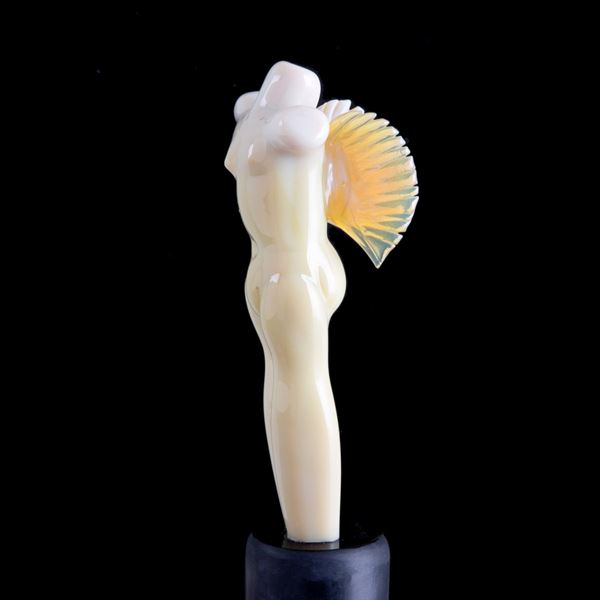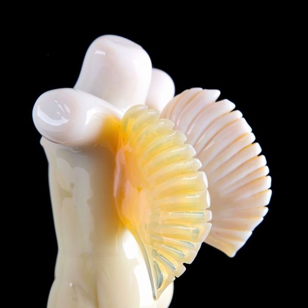 Scultura in pasta di vetro lattimo raffigurante "DONNA ALATA". Base in vetro nero. Firmata alla base.