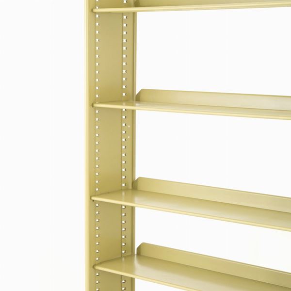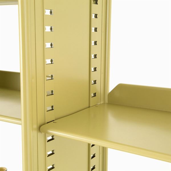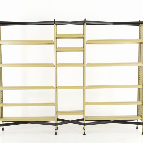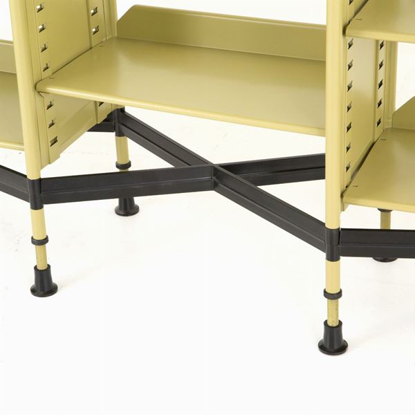 Libreria modulare da ufficio serie Spazio in metallo verniciato, composta da quattro montanti verticali e quindici mensole. Produzione OLIVETTI. 1959.